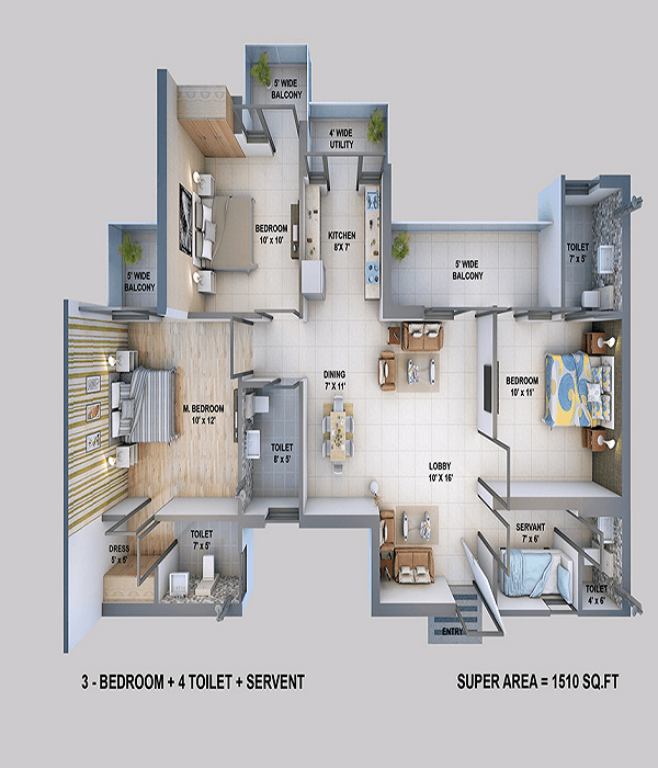 • Walls: Designer concept paint with combination of texture & rich plastic emulsion